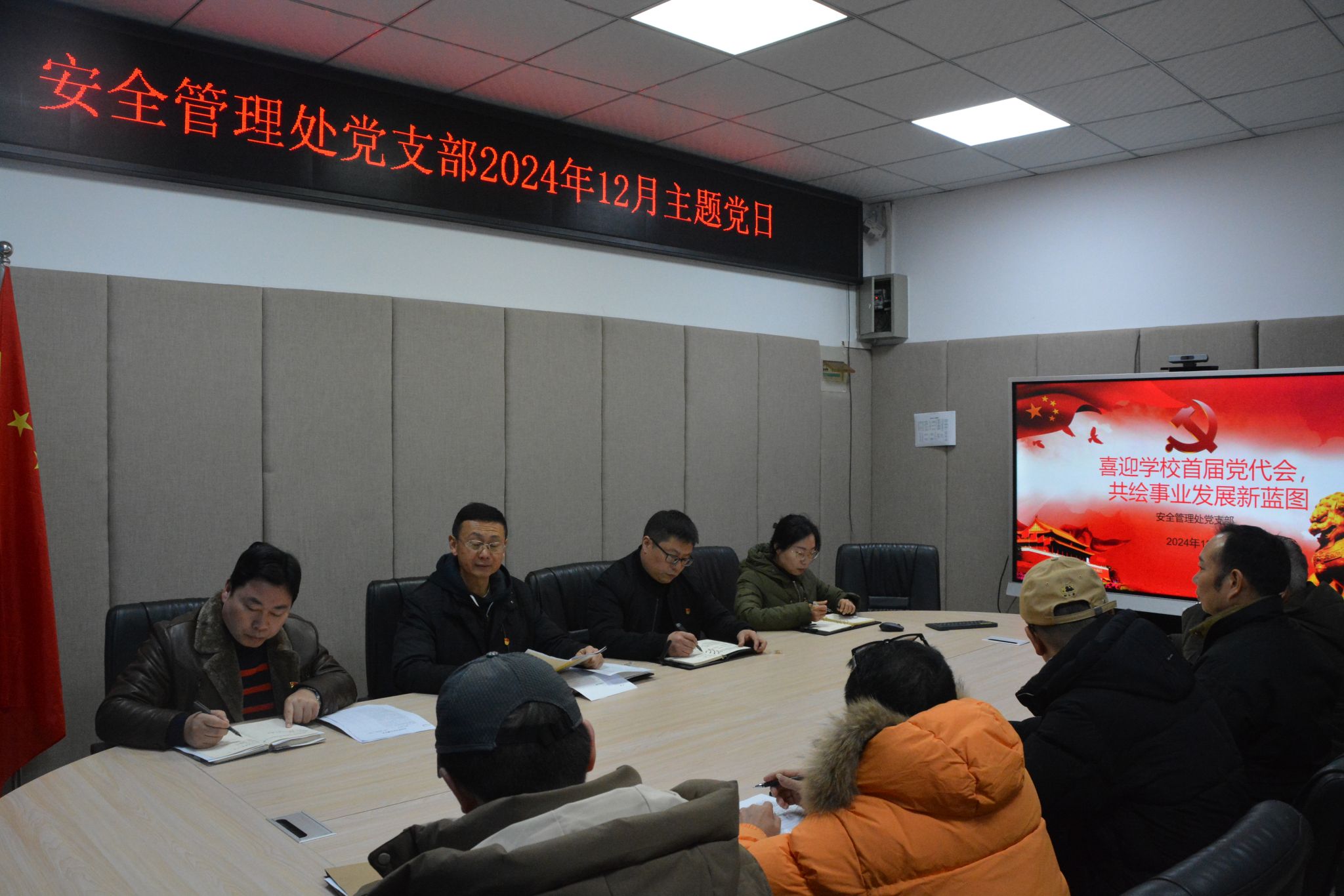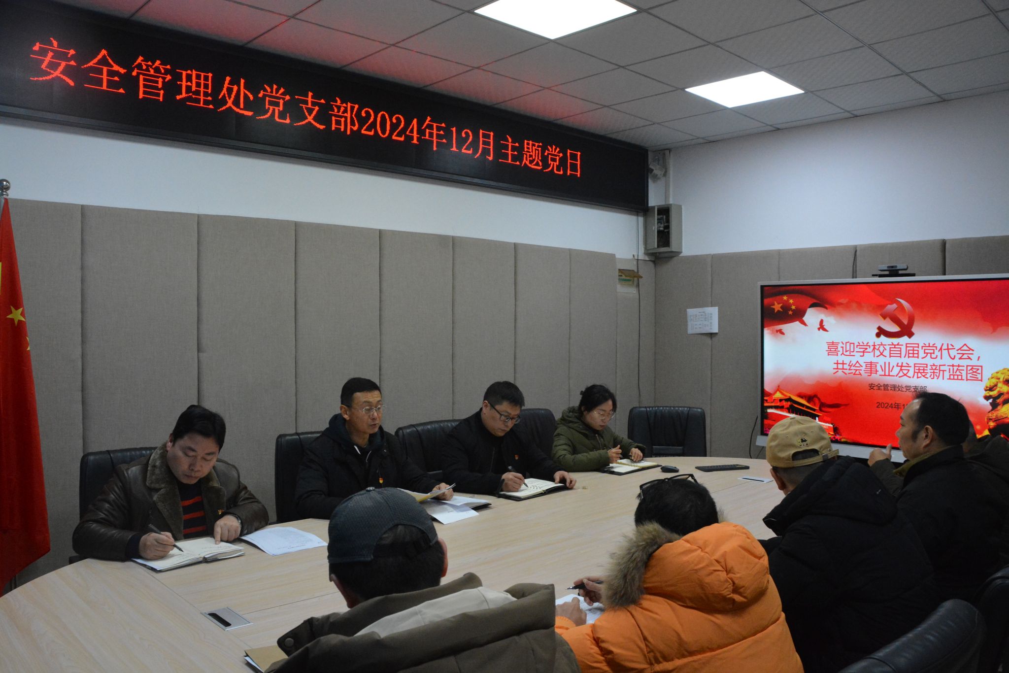 2024年12月20日,安全管理处党支部在博德楼B303会议室开展十月主题党日活动,全体党员参加,支部书记谯新风同志主持本次活动。本月主题党日活动主题为“喜迎学校首届党代会,共绘事业发展新蓝图”。