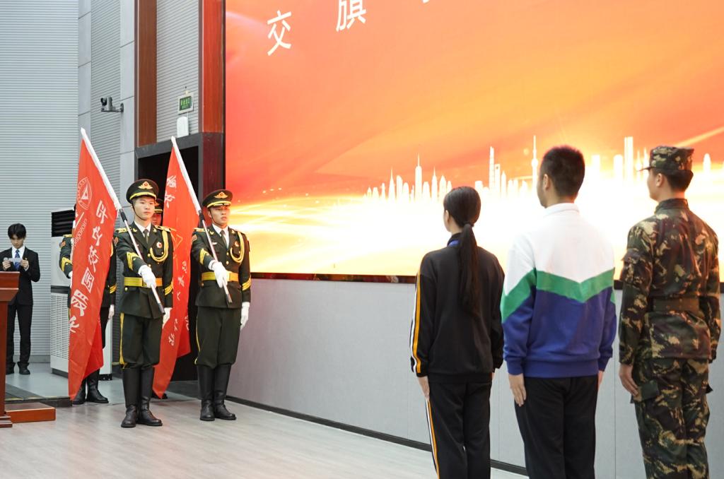 随后,两支队伍进行庄严的交接队旗仪式,队旗由第三届平安校园服务队队长陈壹灵、迷彩青年工作站长黄悦朗与第四届平安校园服务队队长谢哲宇、迷彩青年工作站站长周佳旺进行交接。与会领导为新一届的队员举行授衔仪式。第四届平安校园服务队队长谢哲宇和迷彩青年工作站站长周佳旺依次发言,表达了要努力做好本职工作的决心。