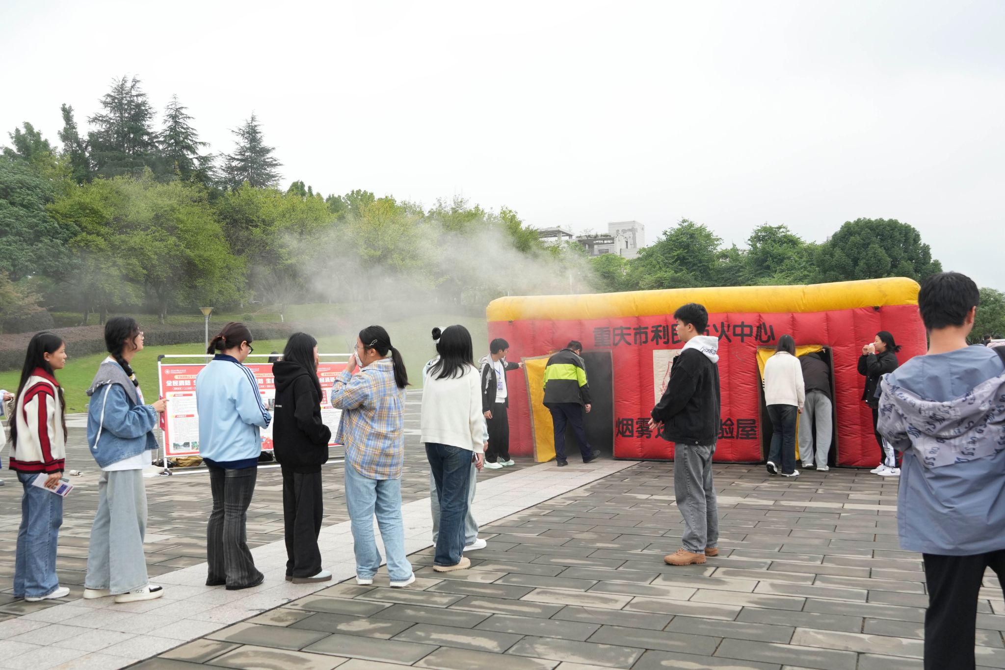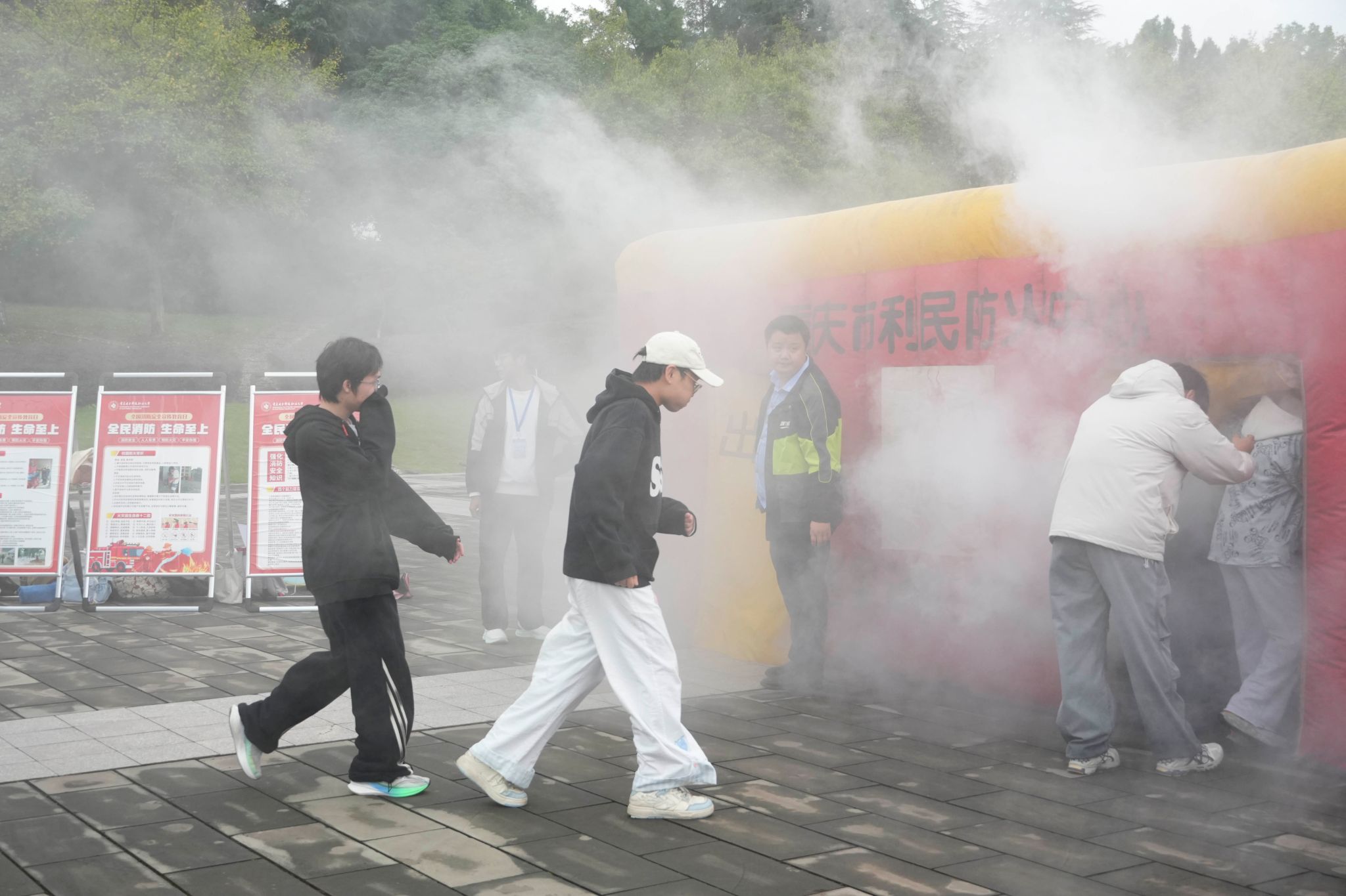 活动中,参与演练的学生在老师的指导下,有序进入逃生屋内,体验场景浓烟密布,黑暗环境,所有学生依然保持冷静,严格按照所掌握的逃生知识进行操作,展现了高度的自我保护意识和应急处置能力。
