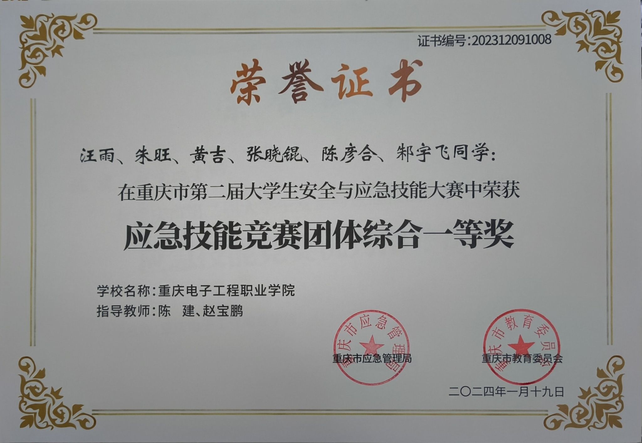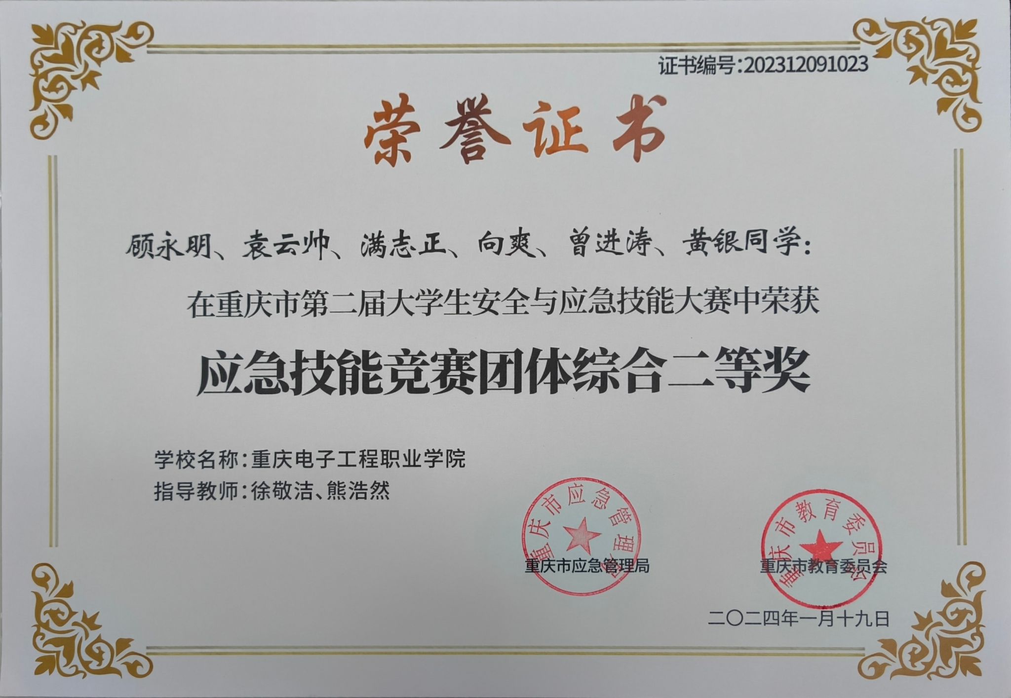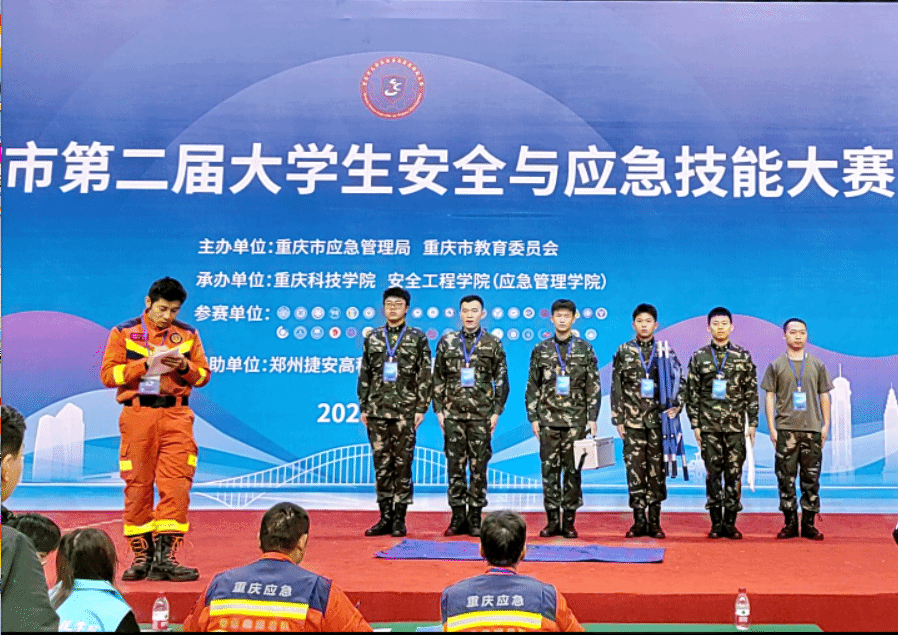 2023年12月9-10日,重庆市第二届大学生安全与应急技能大赛在重庆科技学院举行,川渝39所高校的学生组成了93支队伍参加了比赛。重庆电子工程职业学院“迷彩青年工作站”、“平安校园服务队”、“生命卫士队”三支代表队在93支参赛队伍中脱颖而出,勇创佳绩,“迷彩青年工作站”获得一等奖、“平安校园服务队”获得二等奖的优异成绩。