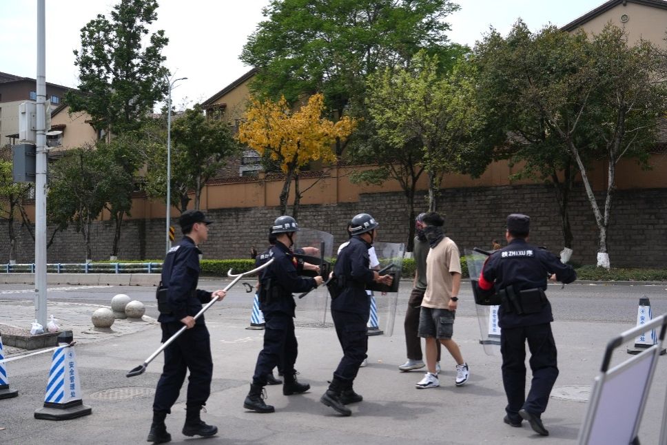 中午13点,演练正式开始。两名“歹徒”(由学校迷彩工作站志愿者扮演)手持“凶器”,试图强行闯入校园。校门口的安保人员立即上前阻拦,大声呵斥并警告“歹徒”停止危险行为,同时迅速按下一键报警装置,向学校应急指挥中心报告情况。