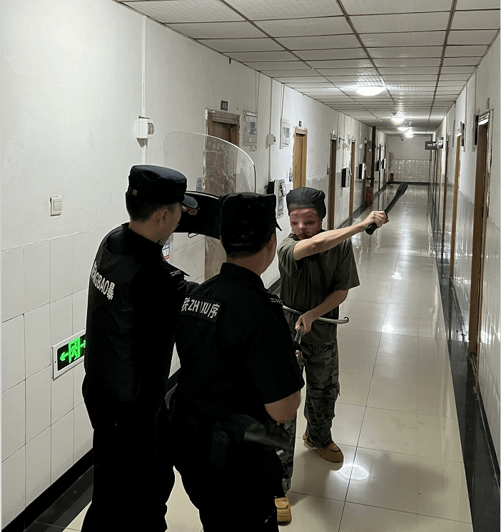 短短一分钟内,安保应急队长带领应急分队携带防暴盾牌、钢叉、警棍等装备火速赶到现场。队员们组成防御阵型,将逃窜至寝室的“歹徒”隔离至无人区域,在确保师生安全的前提下,安保人员默契配合,果断出击,成功将“歹徒”制服并带离现场。